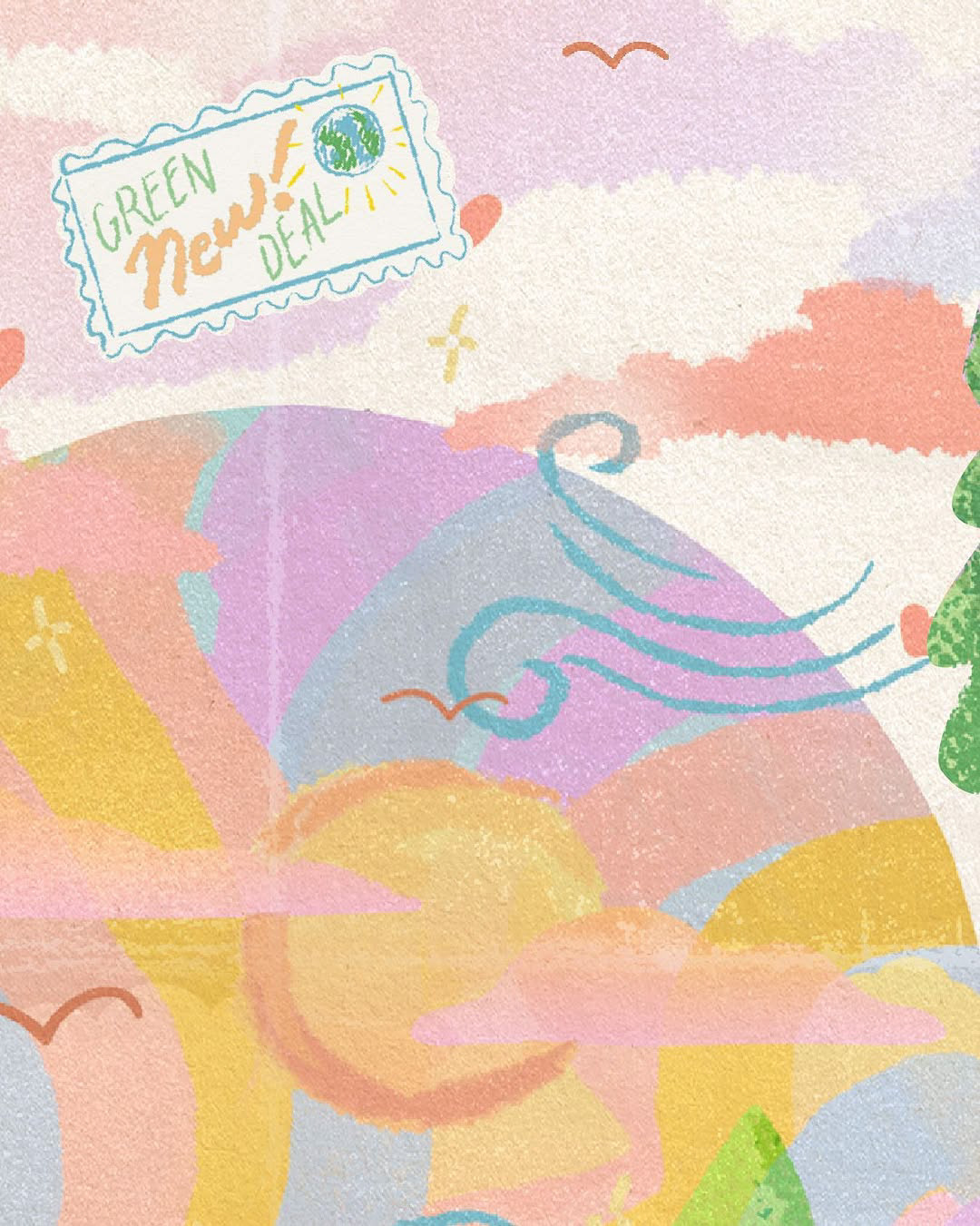 The "Green New Deal" postage stamp element showed up during the process and I kept it because it strengthened the concept. The title "Love the Planet" came from adding this detail, which further emphasized the themes of environmentalism that were naturally evolving through the illustration. This piece represents the looser, more exploratory side of my practice.