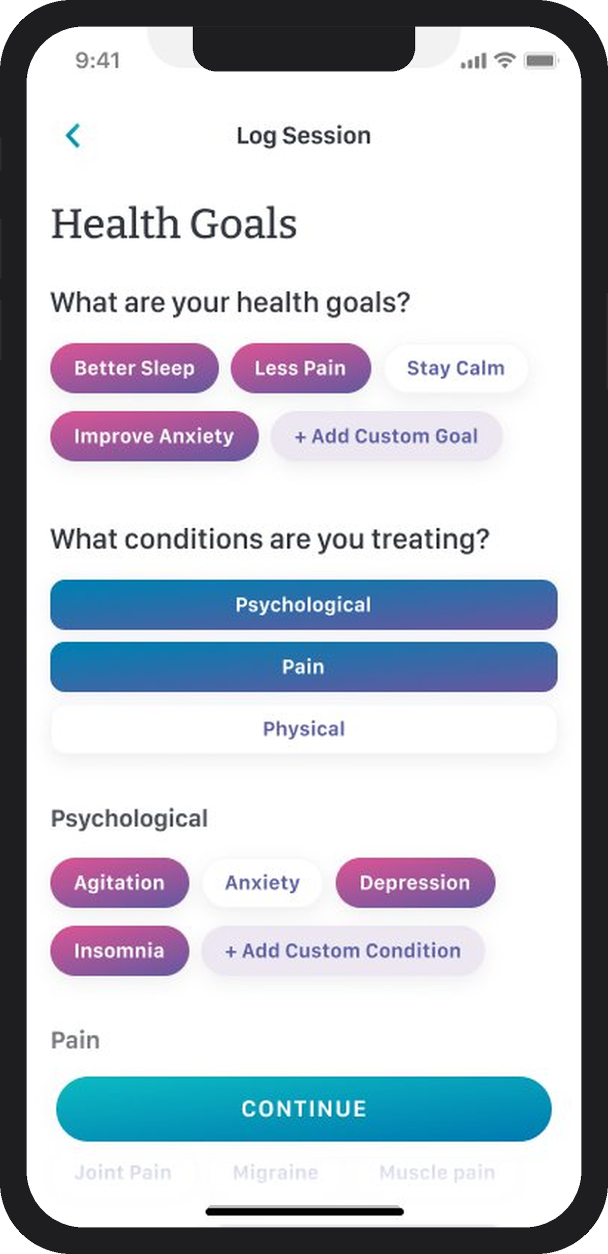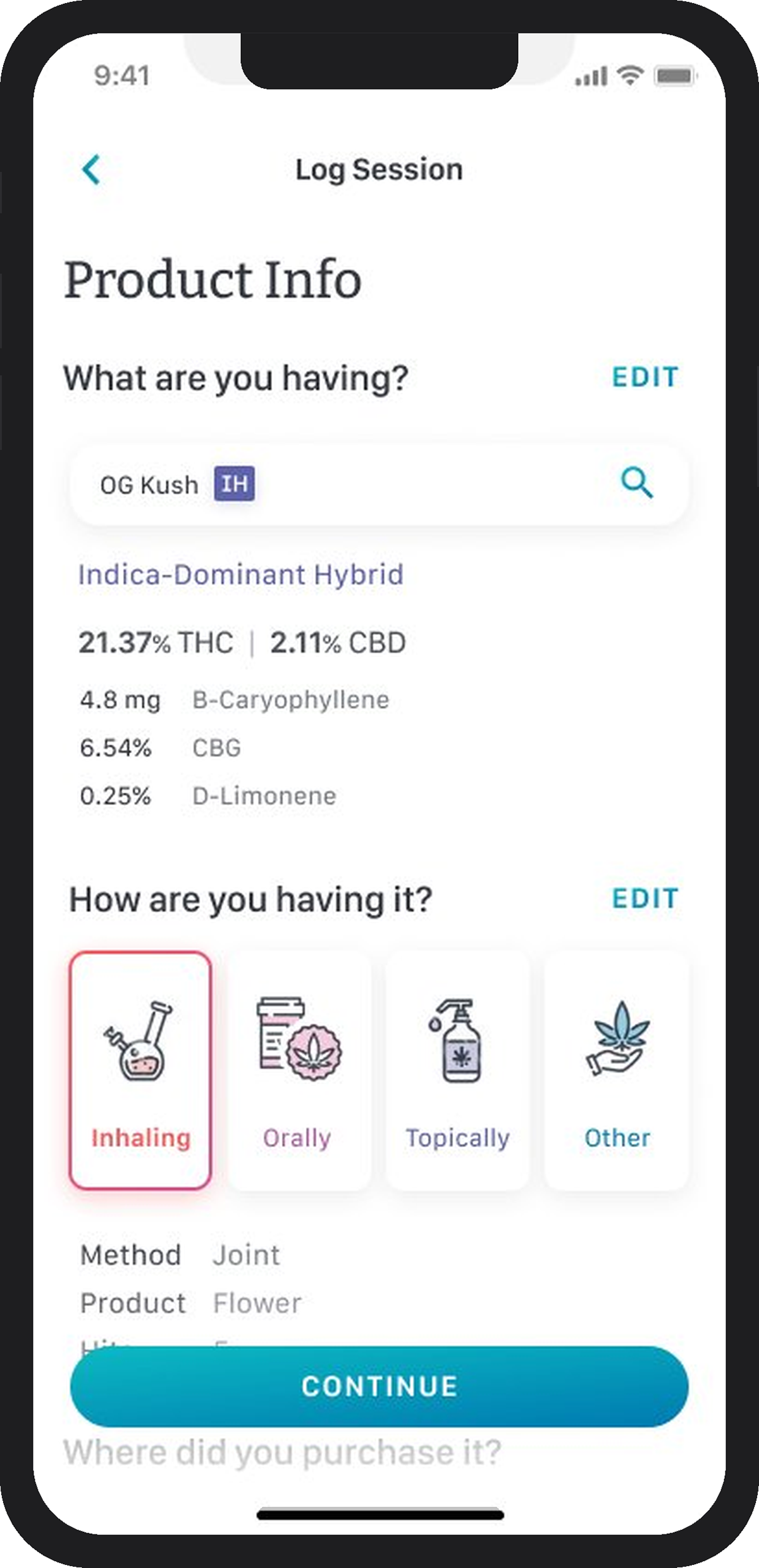 The logging flow is a progressive sequence where each screen asks one type of question. The Health Goals screen uses chip selectors because they show all options at once rather than hiding them behind a dropdown. The Product Info screen organizes dense data (cannabinoid percentages, terpenes) in a clear hierarchy with consumption method icons that turn a text-heavy selection into a quick visual scan.