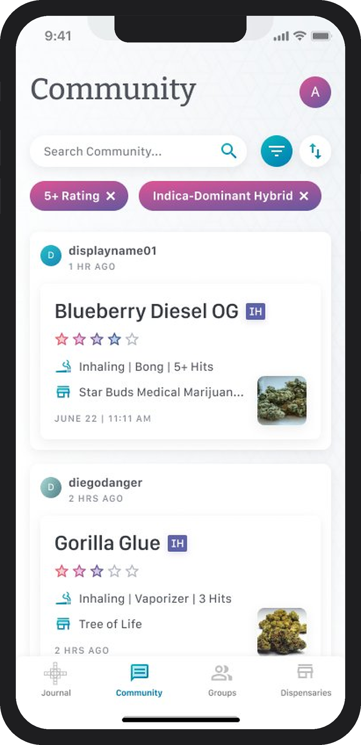 We worked closely with Tetragram's CEO and founder, who is a medical cannabis patient himself. He shared direct insights about users' goals, which gave us a strong foundation. I knew it had to be a friendly, welcoming, and empathetic experience — something that I could picture him using himself. Later during our project process, he shared he would be using this app for his own personal use tracking. The team aligned quickly on making this a people-first interface. The journal-first approach was guided by the goal for users to feel a personal connection to the app — making the experience user-first and personalized lets them keep their own experience journal-only, if needed, with accessible ways to more broadly connect through the Community and Dispensary tabs.